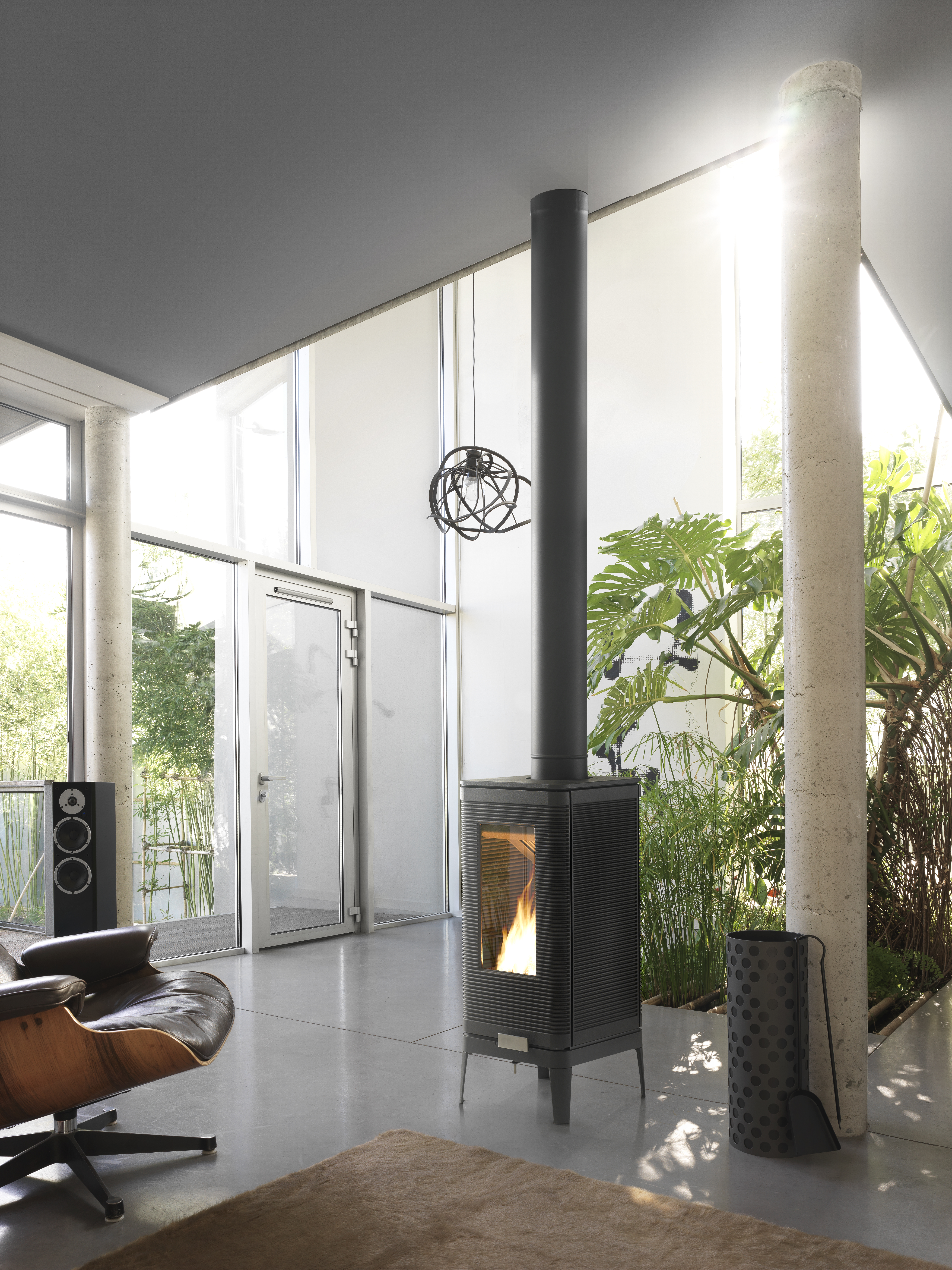 Le système vitre propre permet de ralentir l’encrassement du vitrage. Une arrivée d’air sur le haut de la vitre crée un voile de protection. L’ air préchauffé est propulsé le long du vitrage. Il déclenche la combustion des gaz et des matières volatiles protégeant ainsi la vitre contre la fumée et le dépôt de suie.