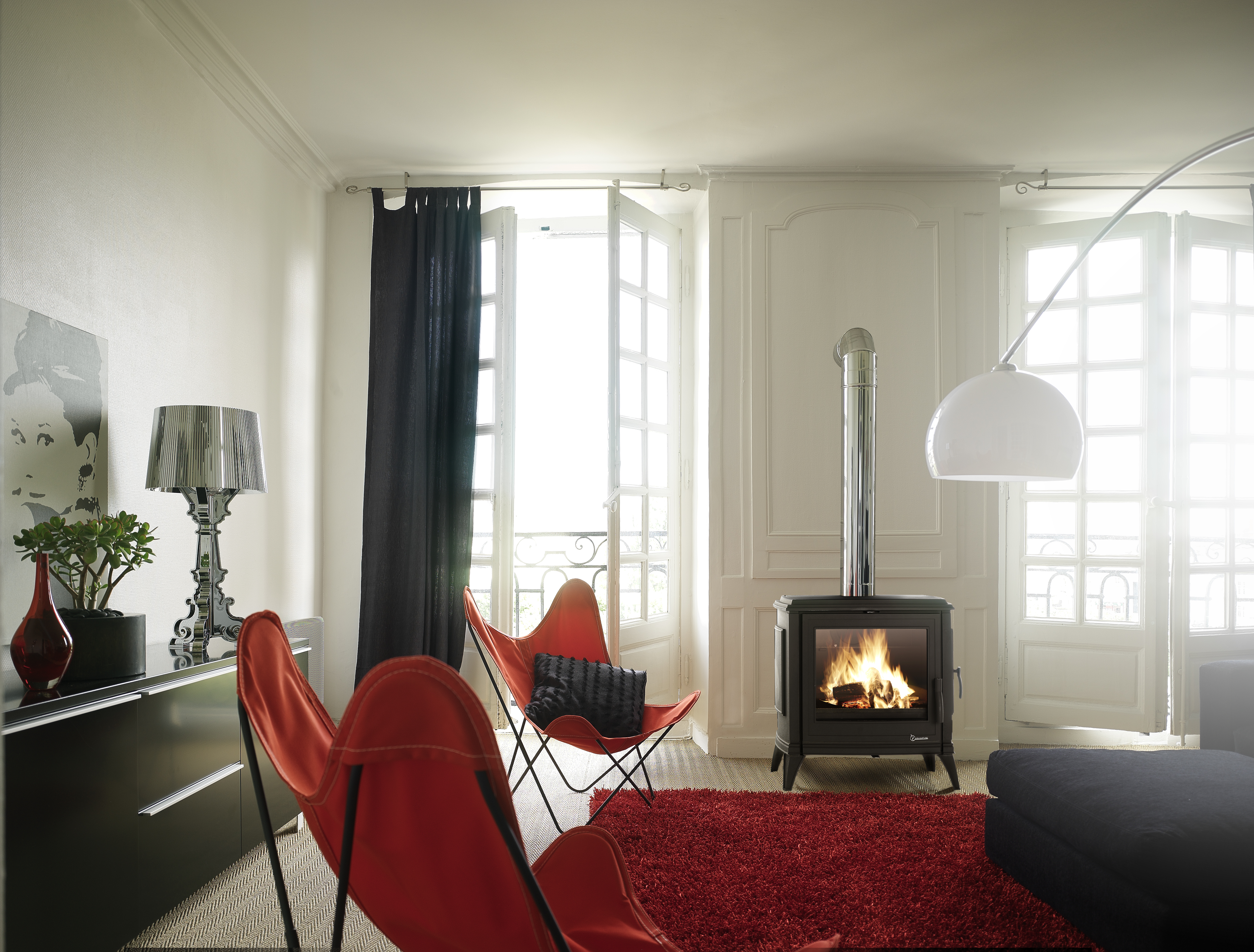 Le style rétro du poêle à bois Sedan L s’intègre parfaitement dans un cadre chaleureux et convivial. Côté pratique, il offre la possibilité de charger les bûches sur le côté.